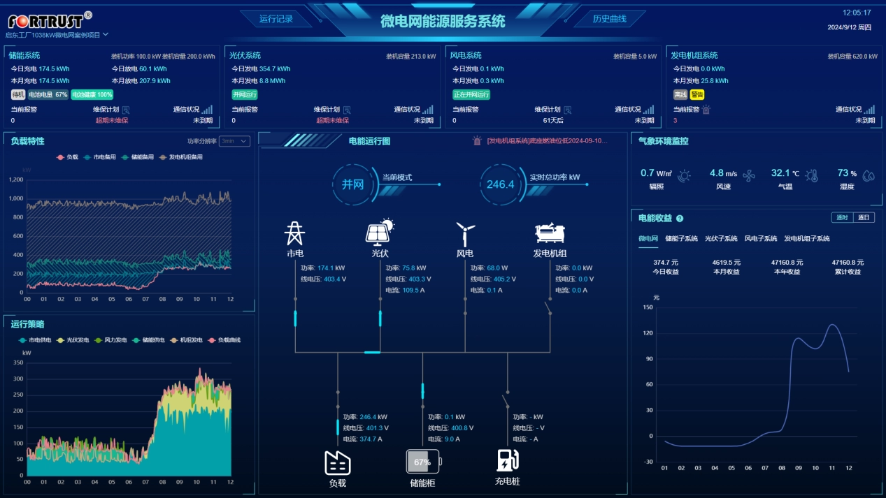 项目由1台EMS(HEMS200)控制3台125kW/261kWh储能系统,光伏逆变器若干台,充电桩双枪120kW5台,市电防逆流电表等设备。混合能源管理系统FPS200经调试满足了该项目功能需求,绿电消纳、削峰填谷,防逆流,防过载的控制逻辑。