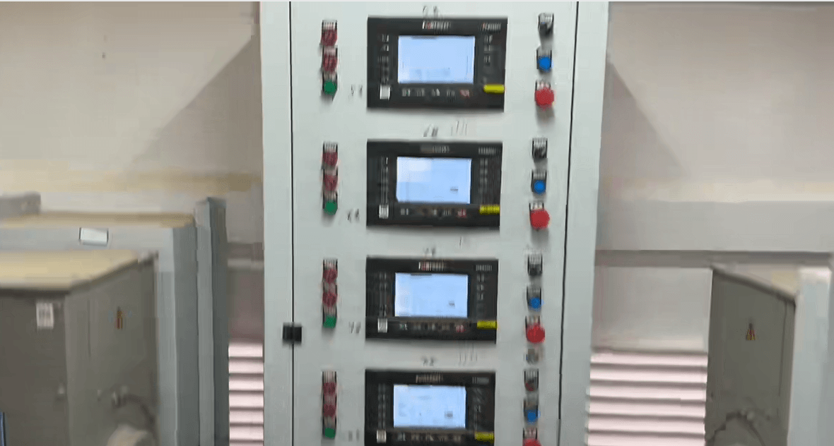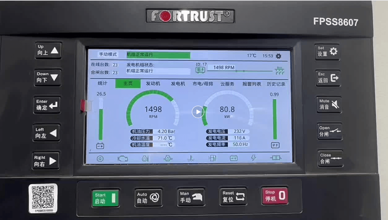 2026-03-07陕西某用户现场,为已安装好的24台电源集装箱并联。24台同一品牌的电喷机组,开机前自动预供油,有自动/手动升降排烟舱门的功能,舱内风机、中冷风机、水箱散热风机通过并联控制器GEC8607的PLC功能进行逻辑编程,实现自动化控制。